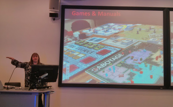 Rachel is a Reading professor and works in human computer interaction, and for this talk she spoke about her work looking at games and how gamification can help us learn, and also help people recover from brain injury. This was a talk of two halves, with the first half discussing games for learning (her software engineering module looks brilliant!) and the second half discussing how games can help rehabilitation. The software engineering games were all board games, here’s a snap of a slide showing some of the games made by students at Reading: