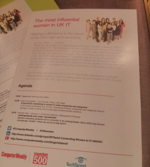 Last Thursday I went to London for the Computer Weekly women in IT awards. I was invited to speak at the event, as well as being shortlisted. I chose to talk about the undergraduate experience: the BCSWomen Lovelace Colloquium for women undergrads, why I set it up, and what it’s actually like for undergraduate women in UK universities right now. The culture of uni in general has got a lot more laddish in recent years, and social media doesn’t help that at all. I also drew heavily on the excellent book “Unlocking the clubhouse“, which came out over a decade ago, and which covers a lot of the problems we’re still suffering from. The talk went well, I think – lots of people came up to me afterwards to discuss it anyway. I think there’ll be some video of the talk up on CW later, and I’ll link that in when I see it.
