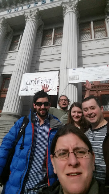Upon arrival in Craiova we had to find the University, which was actually fairly easy. Here’s our obligatory “West Wales Team arrives at meeting” selfie, photobombed by Joan from the Bourgogne team with some style…