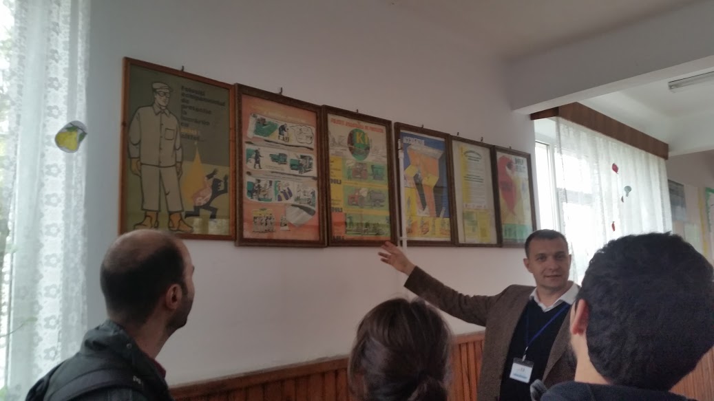 We concluded with a visit to a school – one of the Romanian partners, Liceul Tehnologic “Constantin Ianculescu”. It’s always interesting to see inside schools; the classrooms here seemed fairly traditional (lines of desks, very well-behaved and friendly kids) but the stuff the kids were doing was really quite advanced, particularly mathematically. Here’s Marius Marian of Craiova University explaining some old posters on the wall: