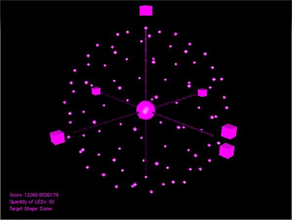 Once we’d got the dome, the next job was to think about mounting lights on the dome. There are a couple of different approaches we can take, but the essential features are that some of the lights are polarised and some of the cameras also have polarising filters. This means we can separate out specular reflections (light that bounces straight off) and diffuse reflections (light that interacts more with the surface of the object). Pete Scully‘s been working on the light placement, doing a lot of work in simulation. Here’s an early simulated placement: dots are lights, boxes are cameras.