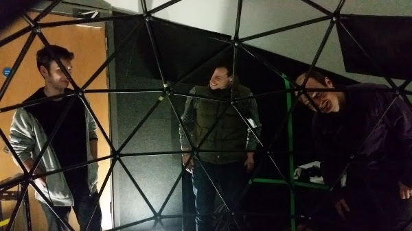 Since the move of room (very recently) things have really picked up. We’ve got a light-proof space, and we’ve got an intern from France (Robin Dousse) working with us too. Andy Starr‘s been working on the electronics and construction from the outset, and during breaks in teaching has really driven the project forwards. Here’s a shot of Robin, Pete and Andy by the dome: