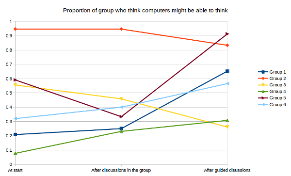 The reason I like to get the participants to vote, repeatedly, on whether they think computers can think, is so that we can see if anyone changes their mind. In my experience (and I’ve run this workshop loads of times – maybe 50 times) people always do change their minds once they’ve thought a bit more about the question; it never ceases to surprise me how different groups can be, too. This time, some groups arrived confident that AI was possible and that computers could think. Some of the others arrived with hardly anybody in the group positive about the potential of AI. We changed some minds though – some in one direction, some in the other.
