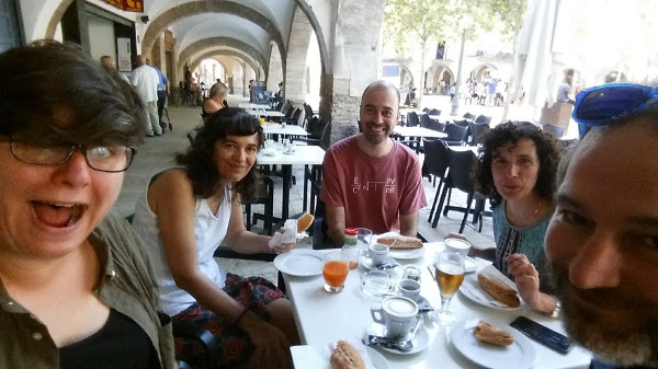 In another room, Marta and Mariona were talking about STEAM and coding, and in yet another room Jordi was talking about various robotics challenges and activities, so the Udigital.edu team was out in force. Here we are having breakfast before the day begins…