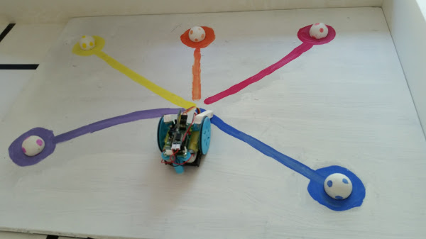 The schoolkids had apparently been working on general robotics projects for a couple of weeks at the end of term, so we started by doing a tour of their demos, and saw some lovely little line followers, skittles robots, hill climbers and generally lots of excellent arduino goodies. Here’s one of their projects.