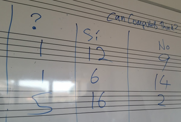 In the workshop Eduard and I ran, we had a set of votes, asking the students if they think computers can think. The way the workshop is structured, we had a vote at the start (to get their initial opinions), then we did an activity which encouraged them to think about what intelligence is, by ordering a load of things (chess computer, sheep, tree, self-driving car, kitten, human… there are about 30 things). This gets them to consider what thinking involves, without actually being explicit or telling them what we think. Then we had another vote. After this we discussed what aspects of intelligence they might think were important, and what aspects computers could do now, then we had a final vote and concluded with some talk about Alan Turing and the Turing Test.