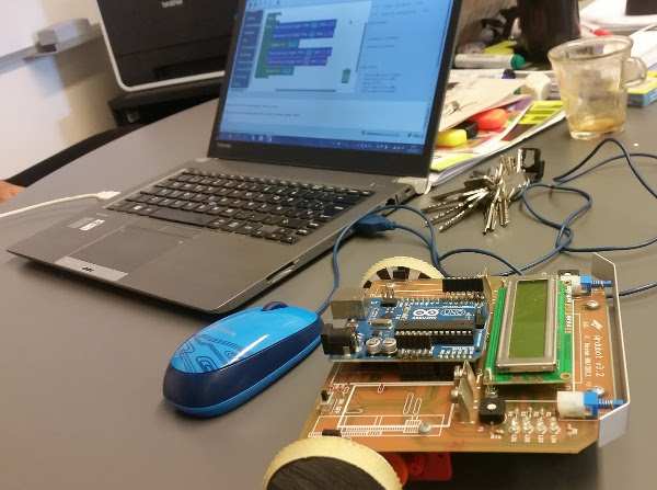 The second workshop couldn’t have had a more different target audience. Instead of teenage Catholic schoolboys, there were adult prisoners in the Puig de les Basses prison just north of Figueres. In this workshop (also designed and led by Xevi) we used small wheeled Arduino robots, and programmed them in groups to flash lights, display messages, and move backwards and forwards. We have done a lot of wheeled robot workshops as part of the Early Mastery project (and before), and this one followed the general format (get something to run on the robot, modify that code, get the robot to move forwards and backwards). We had about 2 hours, and the participants were working in groups. Here’s a picture of the robot (taken during preparation) – you should be able to make out the display LCD, the LEDs and the wheels in this picture.
