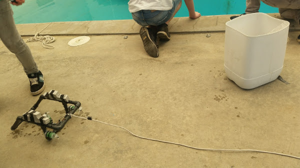 This workshop took place in CIRS (Centre d’Investigació en Robòtica Submarina) at UdG, and was written and led by Xevi Cufi. The group came from a nearby boys’ school, had been working on their robots back in school for a while, in groups, and had come to CIRS for the final construction and testing. These robots are made out of plumbing pipe, and have three motors. Two of these provide forwards and backwards thrust for the left and right sides of the robot, and the third gives up and down. The basic robots were complete before the workshop, and in this session the participants did final wiring (the controller is attached by a tethered wire) and water tests. Once the wiring was done, the first water test involved getting the robot to have neutral buoyancy by attaching floats to the frame, in a large bucket.