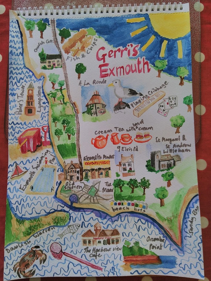 Here’s one of the watercolours, which is a poster of things around Exmouth that my sister in law might like: