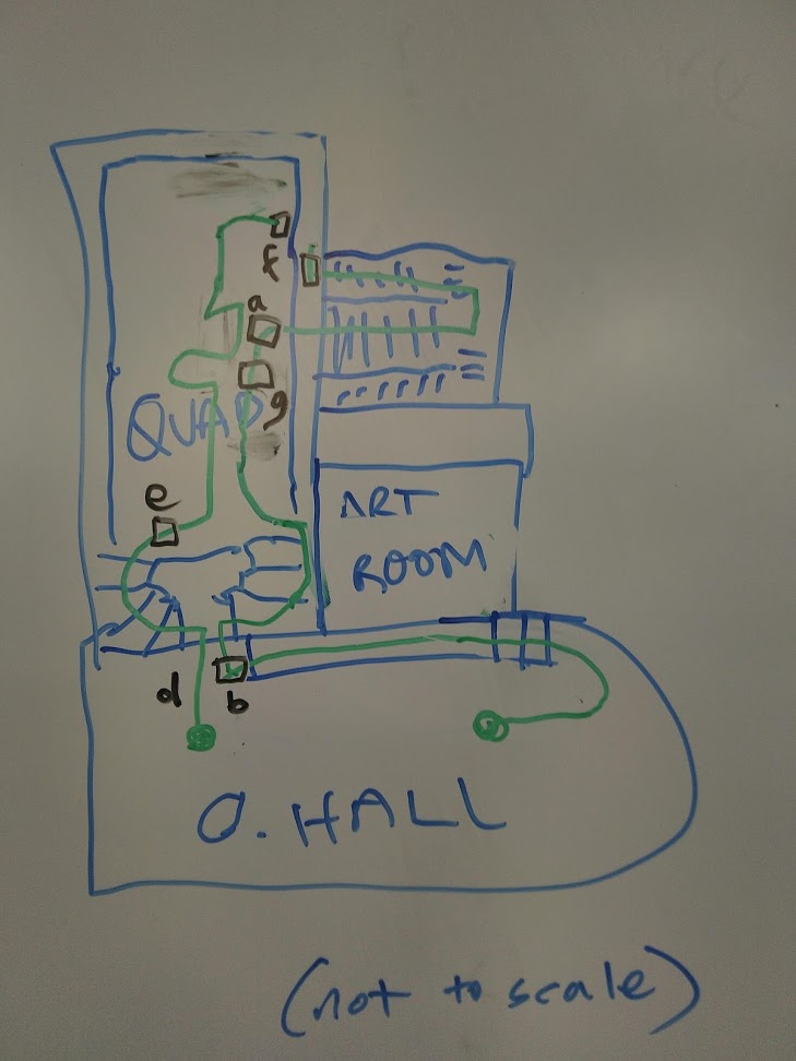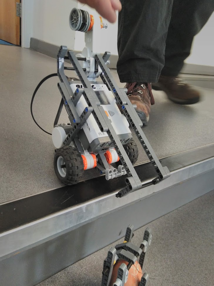 The idea was to use lego robots, string, drainpipes, and pretty much anything else we could lay our hands on, to take an egg around Old College. We’re very lucky to have access to Old College, which has balconies, ramps, stairs, multiple rooms, and all sorts of furniture we’re able to shift around. Back in January we had a planning meeting one Sunday afternoon, and thought about the space then tried to make robots ourselves that could do the right kind of thing. The general idea was to have a series of stages – some easier than others – with each stage starting and finishing on a piece of carpet. When you’re on the carpet you can move the egg from one robot to the next. This meant that the robots had to be able to perform the moving of the egg but not the handing over of the egg (simplifying the task considerably).
