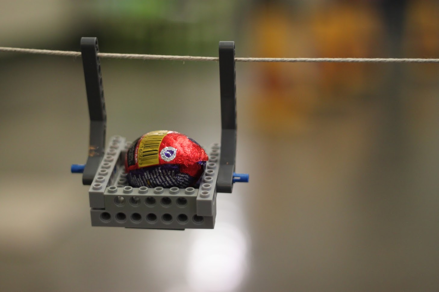 Each team was given a creme egg for testing, and they set about building their contraptions. It’s fascinating to see the different techniques people choose to use; very few of the solutions invented on the day matched those we’d come up with during our pilot session. In particular the “down a couple of stairs” one where our experienced roboteers created as a careful winch-based system, ended up being a robust egg case on a robot which just drove off the edge of the steps and self-destructed. I think the kids version was more fun, if less re-usable.