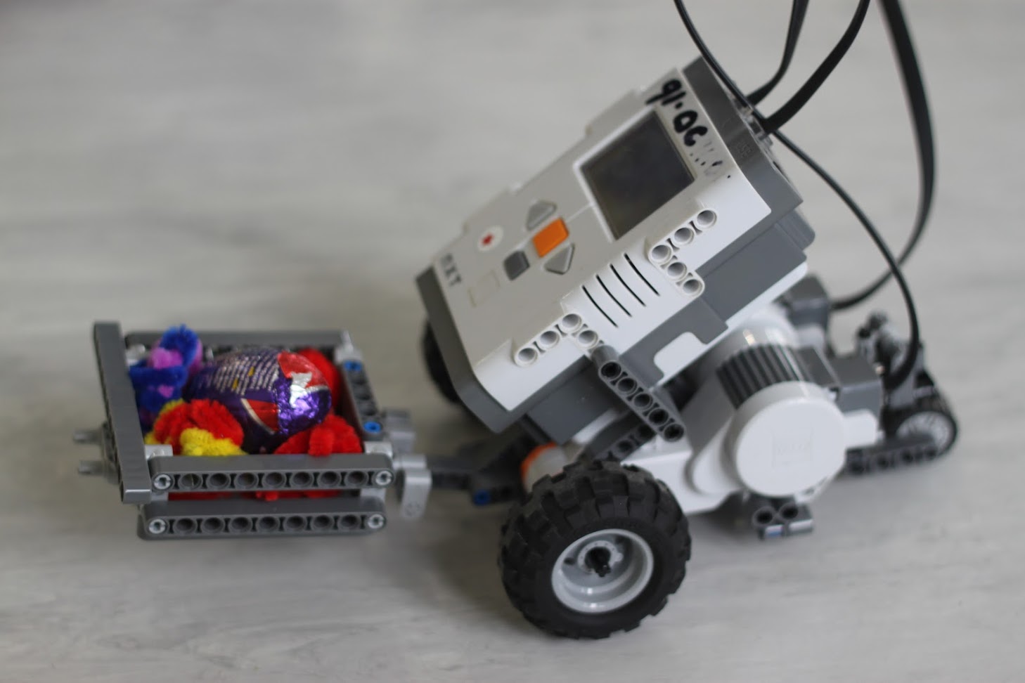 Our robots – created during the planning session – were able to deal with versions of these challenges. “Up a ramp and down a stair” was I think the most complex robot we built – it had an egg-holder with a winch so when it got to the top of the ramp it could let the egg down gently.