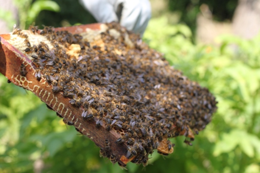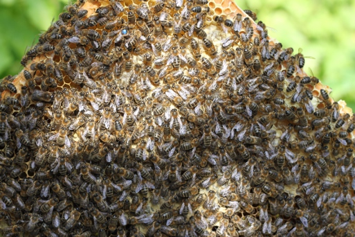 You can’t see clearly with all the bees in the way but you’re looking for fairly specific things: “brood” (eggs or larvae) look different to honey, and nectar and pollen are fairly easy to spot. The bees are in the way but you also have to realise that they’re constantly moving so you can see what’s underneath them pretty easily.