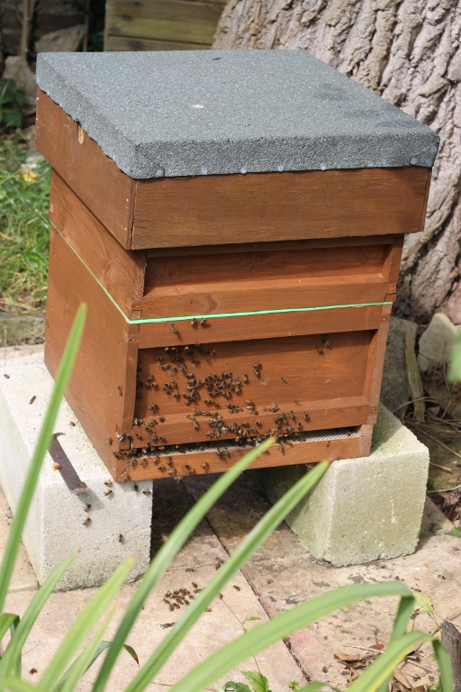 We hope to get some honey from one hive later this year. Hive #1 has a super on top (you can see it in the bottom photo, it kind of looks like a 2 storey hive), and between that and the hive is a queen-excluder so that part of the hive will only be filled with honey, not eggs. Once it’s full, or nearly, we’ll steal the honey. We did taste a teaspoon a few weeks ago though and it’s delicious.