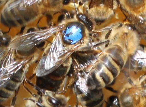 The queen’s got a blue dot because 2010 is a blue year. No, seriously! When you get a new queen you can catch her and mark her, and the UK beekeeping association recommends using a colour that identifies the queen’s age, and 2010 queens are blue. The spots sometimes fall off so it’s not a perfect system, but it does let you know roughly how old she is. Roger didn’t mark this one though, she came marked from the bee shop.