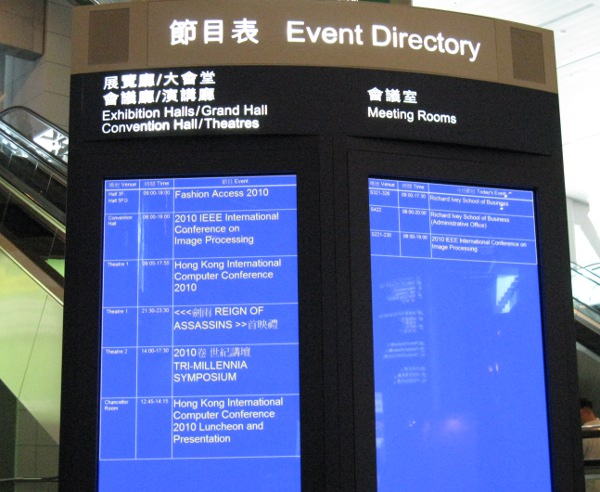 I’m currently at ICIP2010 in Hong Kong, which is a massive multi-track image processing conference organised by the IEEE. I think it’s one of the larger conferences I’ve ever been to – there are over a thousand people here, and at any one time there are 10 sets of paper presentations (lectures) and 10 sets of poster presentations. It’s at the Hong Kong Conference and Exhibition centre which is a humungous building built on reclaimed land to the north of Hong Kong Island. It’s supposed to look like a seabird, but I’m not so sure it manages to pull that off.