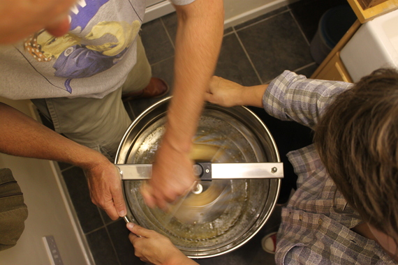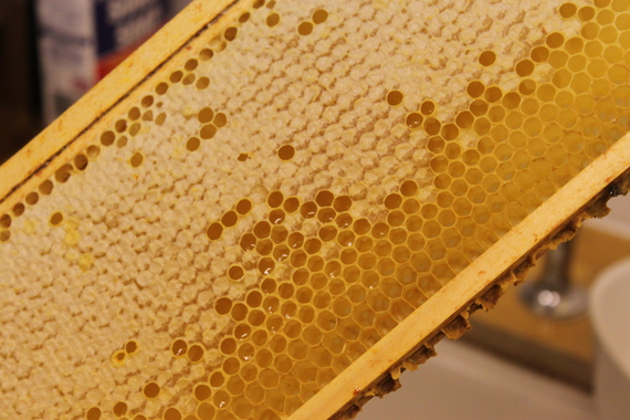 Then you spin the frames, and the honey splatters out against the walls of the drum.