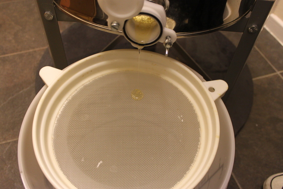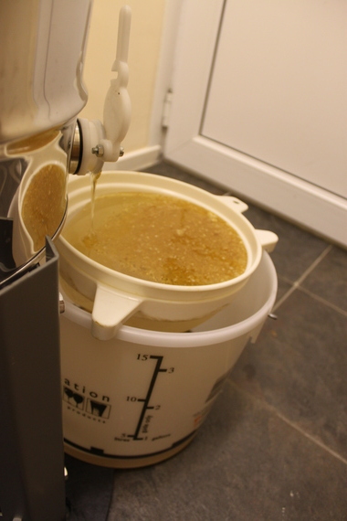 After a while – about an hour, I think, of taking it in turns to crank the handle and weigh down the machine – we had quite a bit of honey. About 2.5 litres.