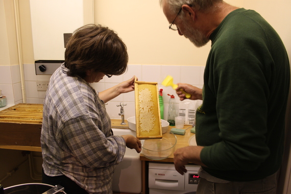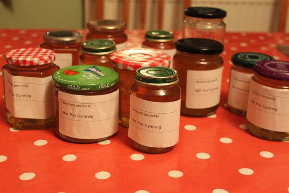 We’ve had bees for about two years, and this week, we got our first honey. Roger decided which frames were full enough to bother extracting from, and we kept these inside and out of the way of the hives (the bees don’t like you stealing their honey). We borrowed a centrifuge for extracting the honey from the Aberystwyth Beekeepers Association and then it was a case of cleaning up the utility room, washing some jars, and getting on with it. The advice was that honey would go everywhere, but we didn’t have that much honey and it wasn’t really that messy in the end.