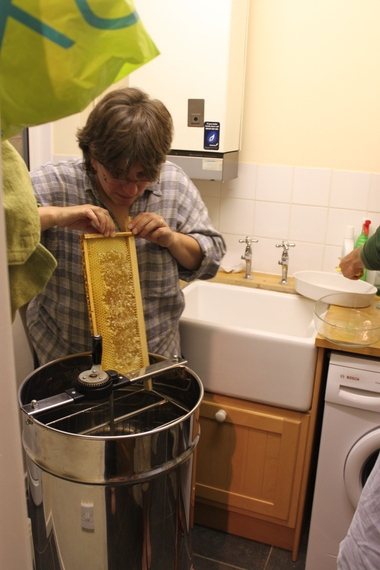 Here’s a video of the spinning in action – it’s a bit loud, and it’s hard work. The centrifuge is basically a machine for splattering honey up the sides of a big pot, so it’s not the most efficient of mechanisms.